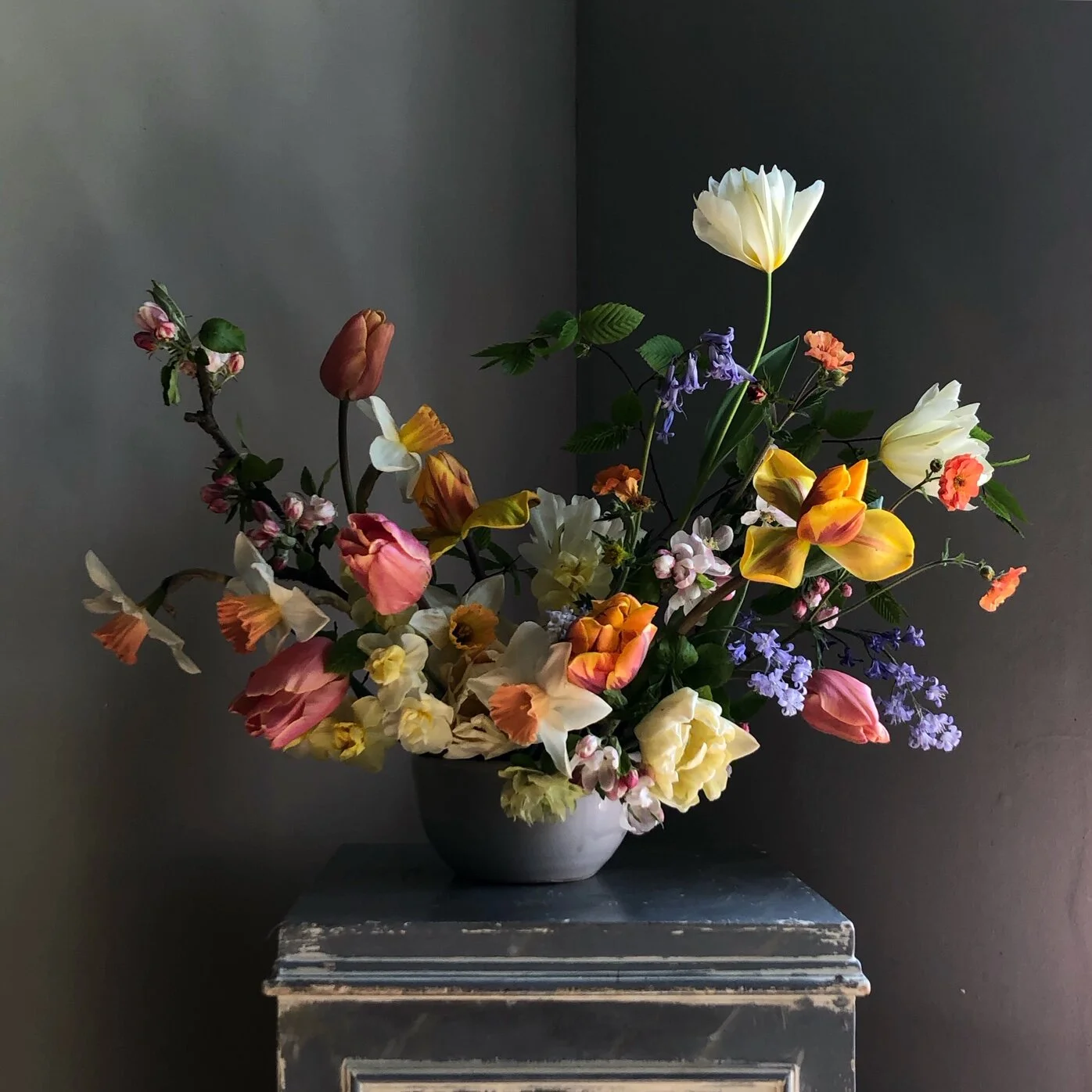 We are excited to launch our free online course, Stay at Home & Get Creative. On our course page, we offer a series of talks about the fundamental skills needed in floristry such as conditioning, non floral foam methods, working with colour, photographing your work. We also have put up 27 floral demonstrations. Each one has a step by step guide, but if you would rather you can just click on the tutorial and watch how I would go about creating the display.